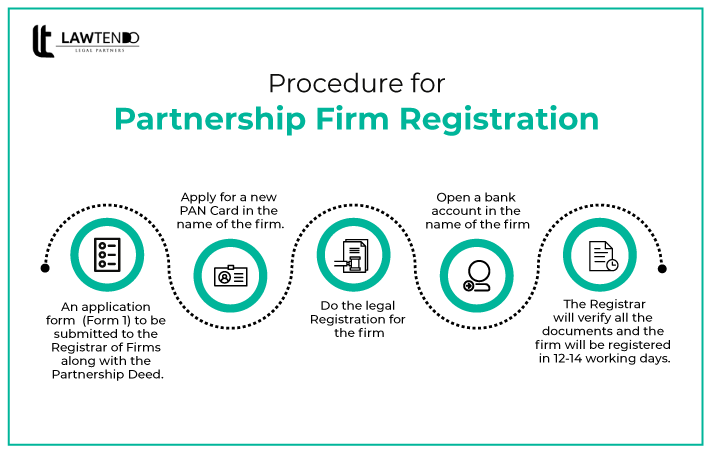 Application to the Registrar of Firms via the prescribed form (Form A). Nowadays this facility is available online. The application must contain some basic details about the firm such as- Name of the Partnership Firm, Name, and address of all partners, Place of business (address of main and branch offices), Duration of the partnership, Date of joining of partners, Date of commencement of business.The duly signed copy of the Partnership Deed (which contains the terms and conditions) must be filed with the registrar